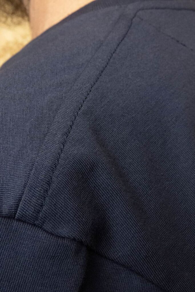 Knitted into jersey in Leicester. Sewn into T-shirts back in Manchester. That’s pretty local right?