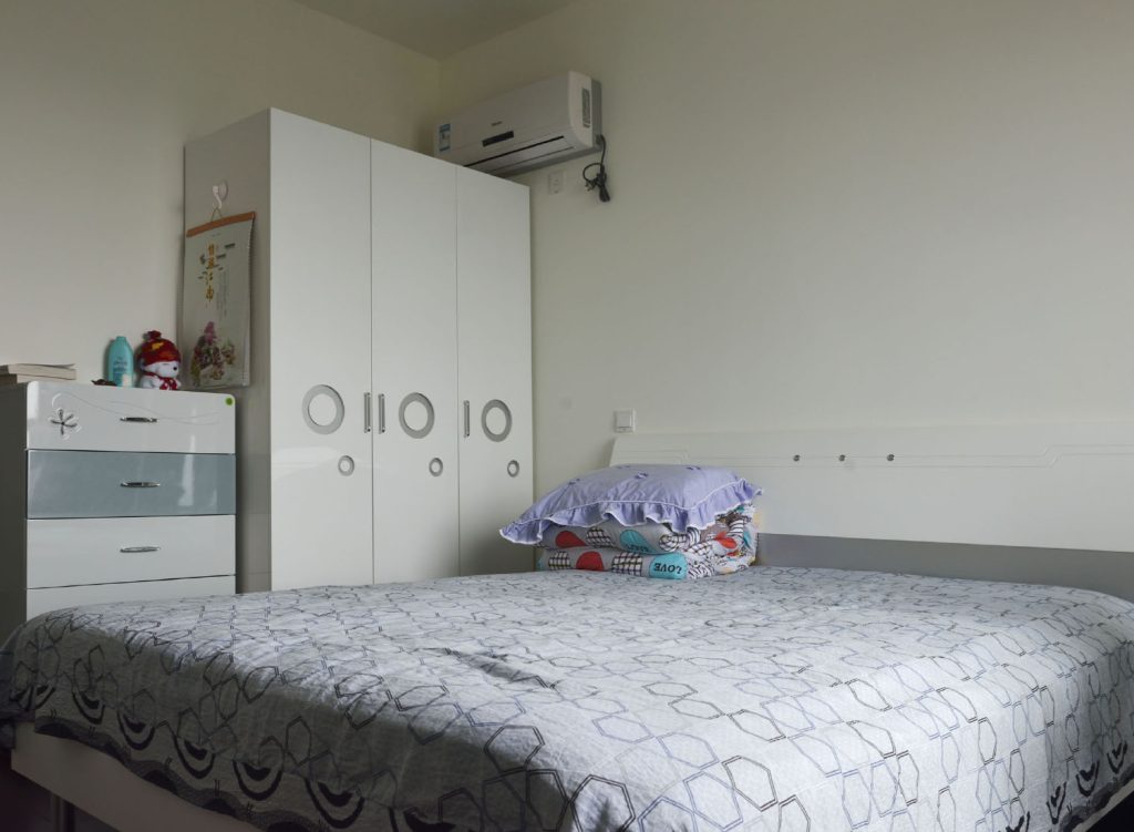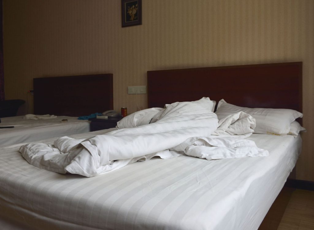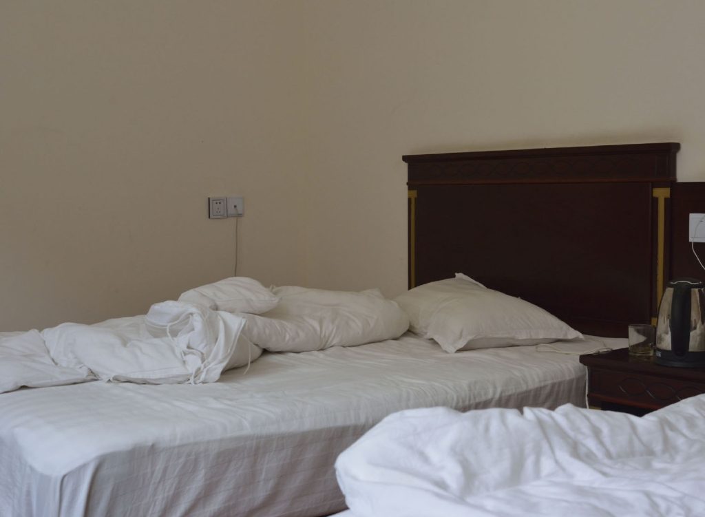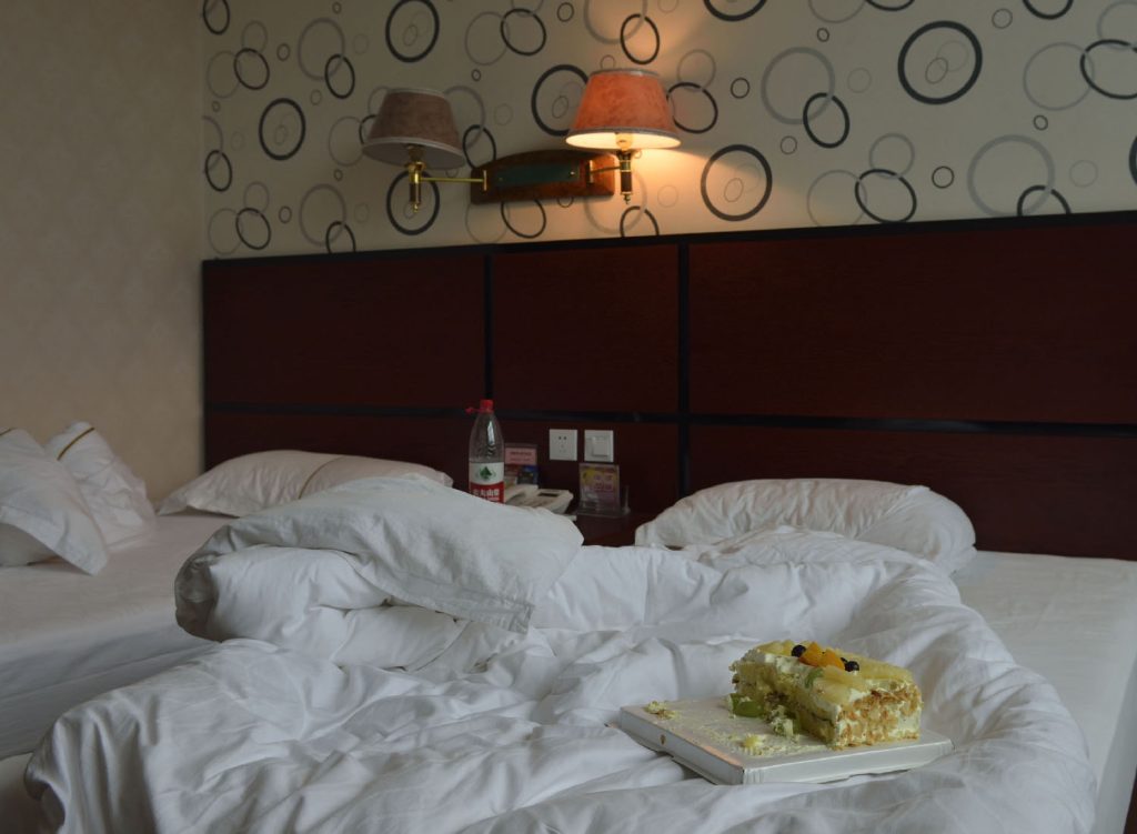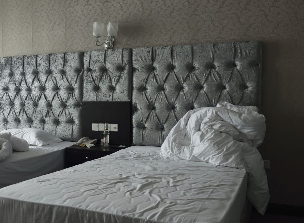 I pick the most outrageous bed and lie down in the middle. We’d seen young students coming in and out. And I am anticipating some loud noises, but everyone seems quiet.