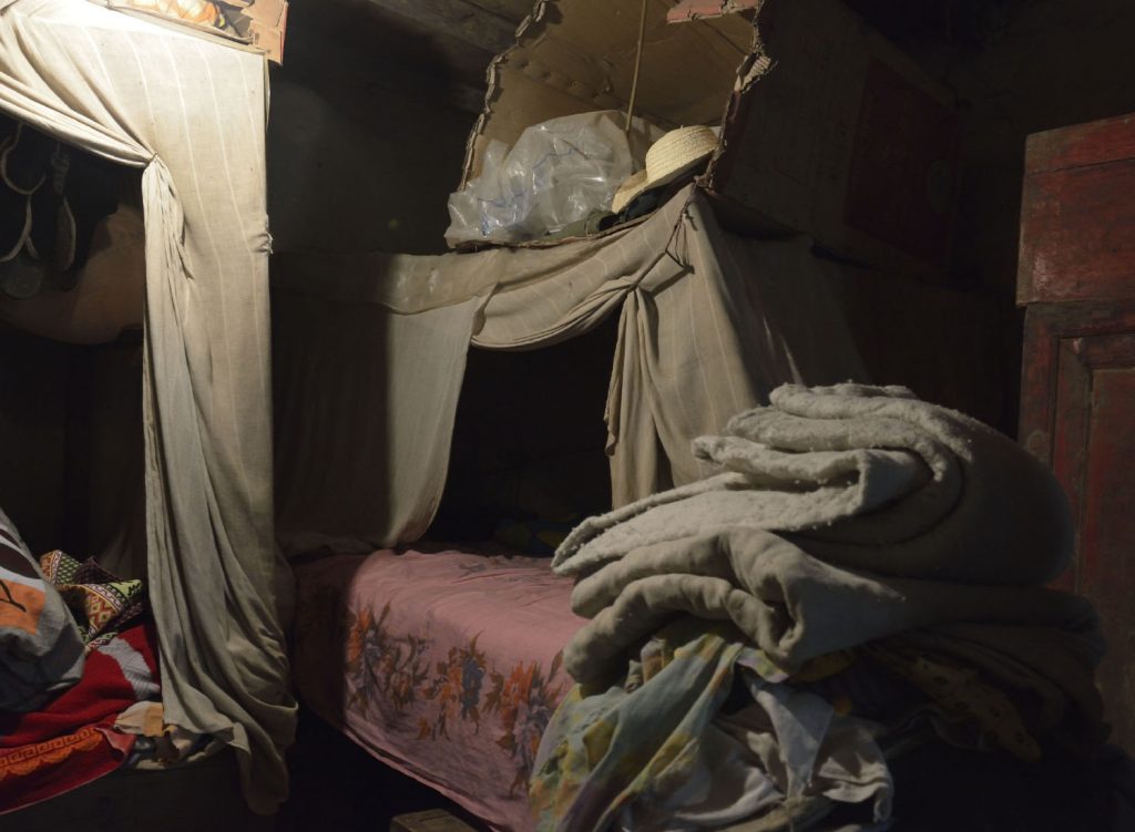 Between the front room and the kitchen, there is a small storage section. Piles of potatoes flood the floor and homemade sausages populate the ceiling. In between them, a beautiful coffin sits squarely. Our host has prepared for his own funeral!