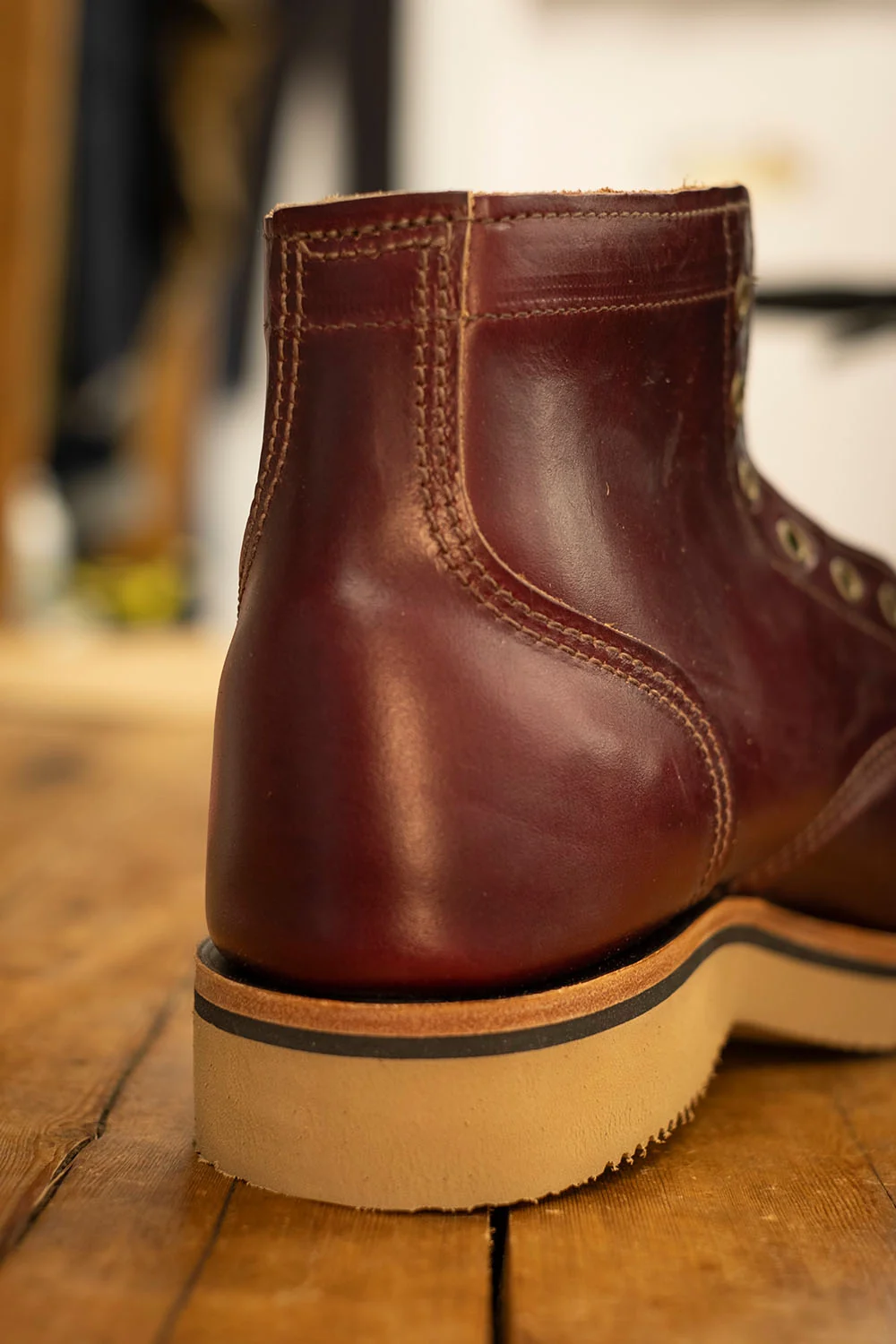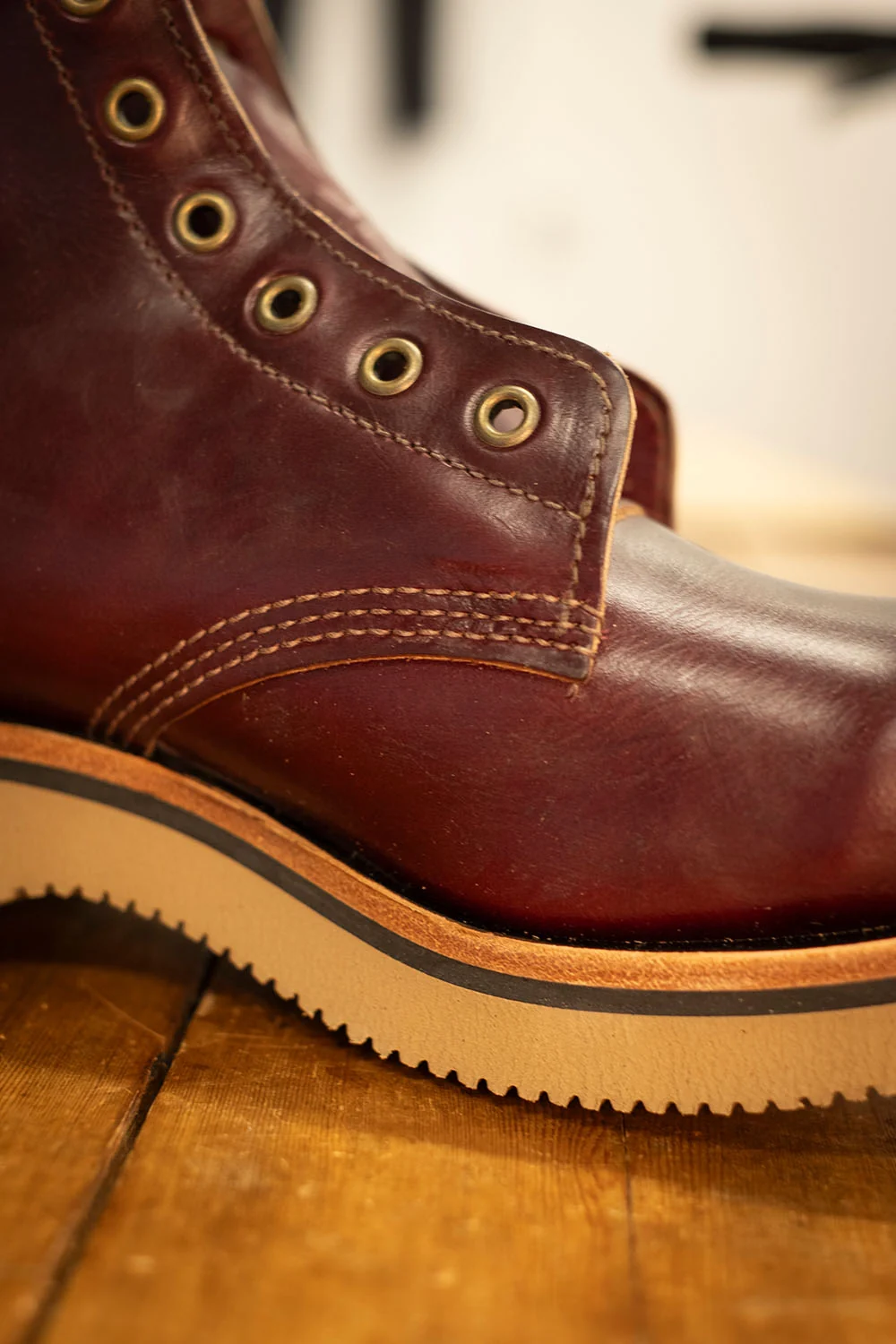 A defining feature of William Lennon boots is their construction. The uppers are screwed directly into the sole using a rare BUSM Rapid Standard brass wire screwing machine. There are only four of these machines known to exist today, three of which are at William Lennon’s. This method of sole attachment predates Goodyear welt, and is still one of the strongest methods ever used.