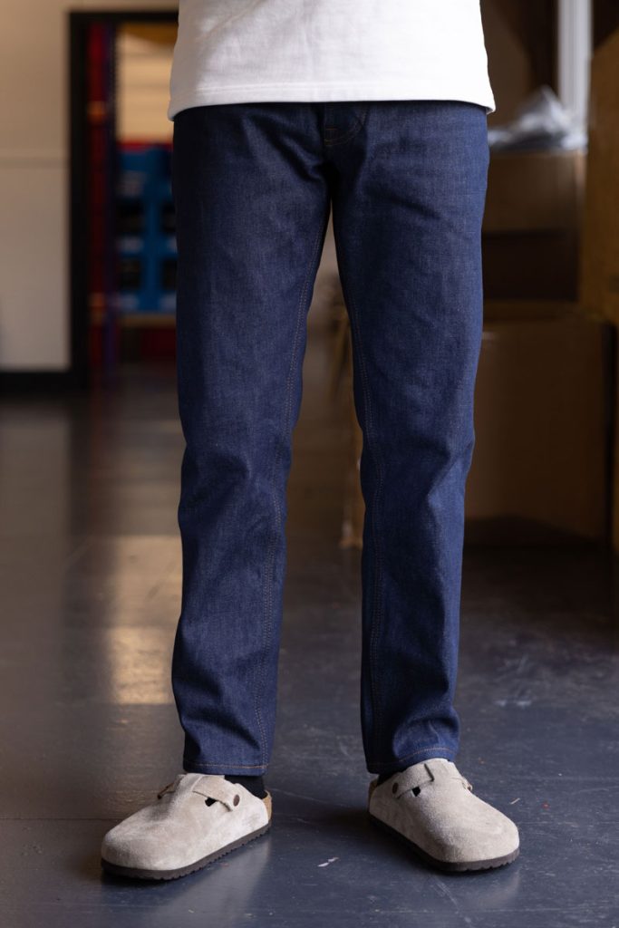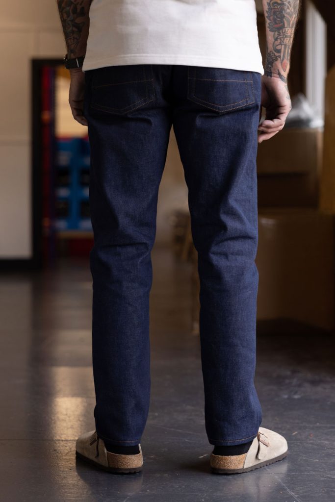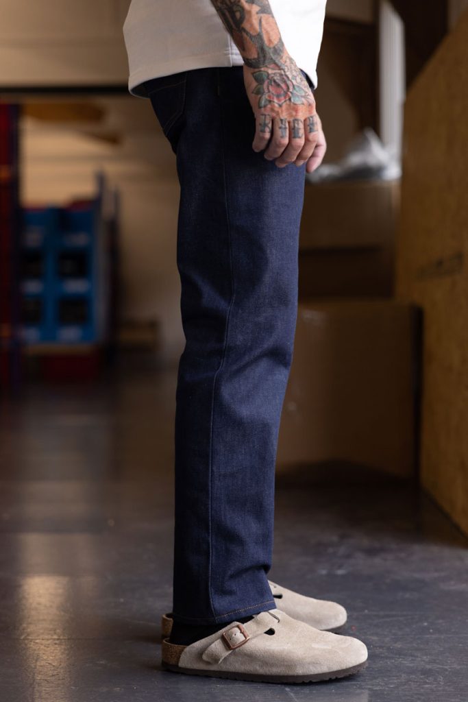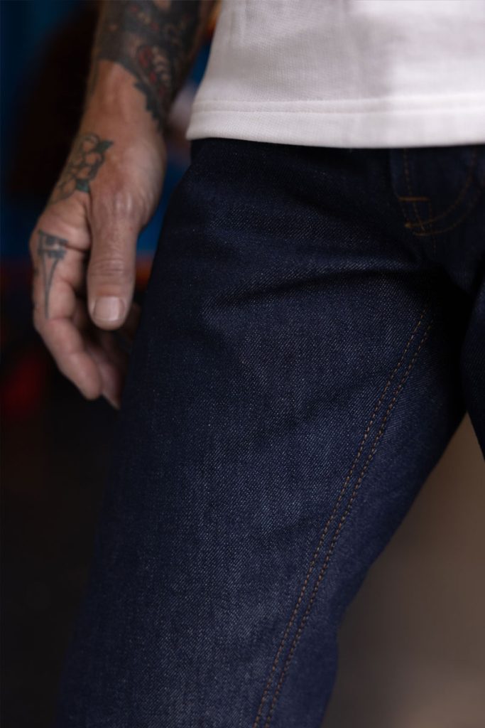 Eco 13oz denim, hardwearing, 100% cotton, deep indigo from the Candiani denim mill.