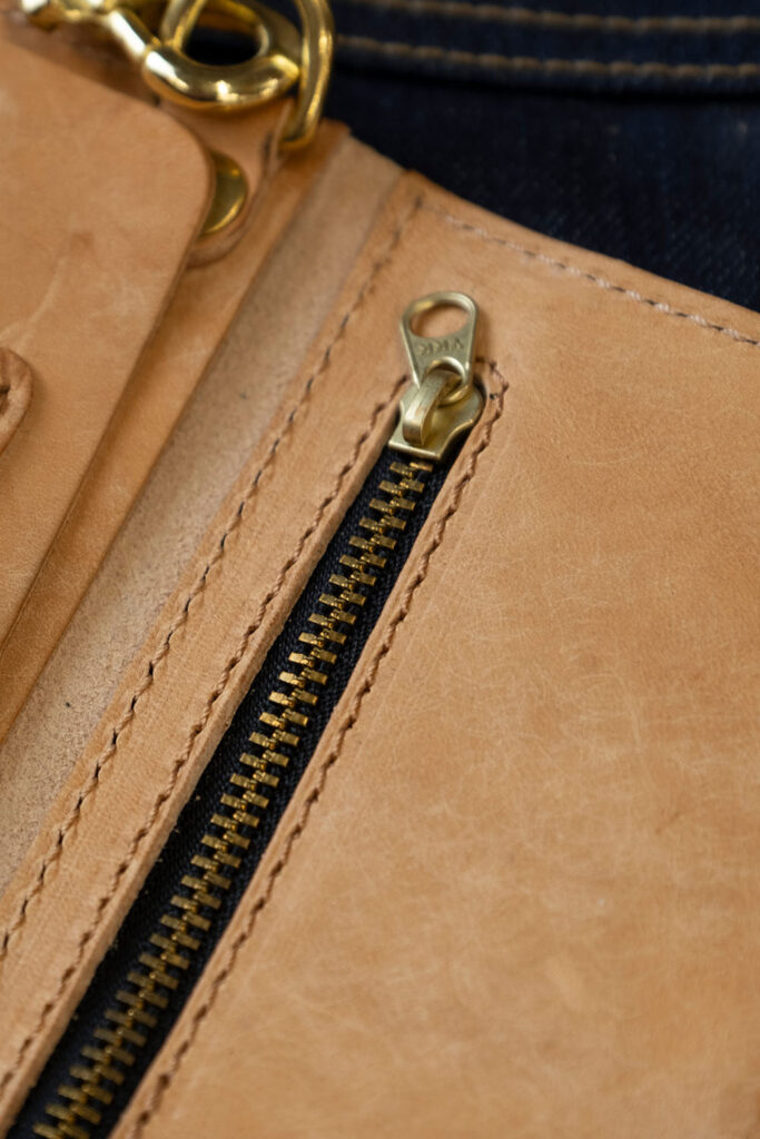 Heavy duty all brass fasteners throughout with double press stud closure, YKK coin pocket zip and a fixed shackle ring to attach an 8mm thick, solid leather strap. D-shackle with threaded screw fixing attaches to the belt hook and a solid spring clip secures the wallet to the strap. Belt clip is securely bound and knotted to the strap by hand under high tension with high grade reinforced yarn. Heavy clip bound to the strap in the same way and securely fixes the wallet to the strap so you can carry the Maximus in your back pocket. Everything is accessible to you without having to ever remove the Maximus from its strap.