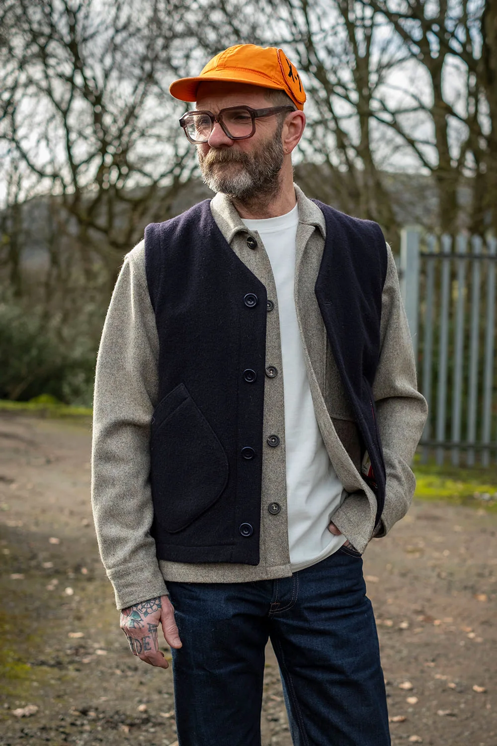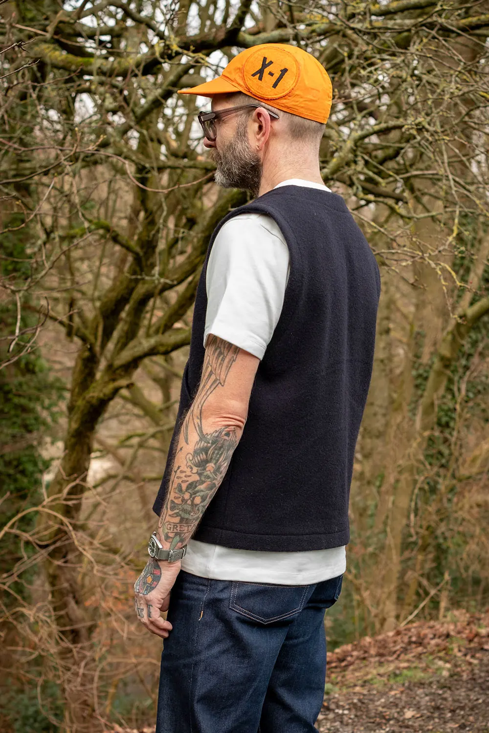 We class it as outerwear. It is not a waistcoat. It’s cut to sit comfortably over an overshirt – like our USB37 – but the same size will look equally as sharp worn over just a t-shirt. That versatility makes the Melton Vest an inter-seasonal grafter.