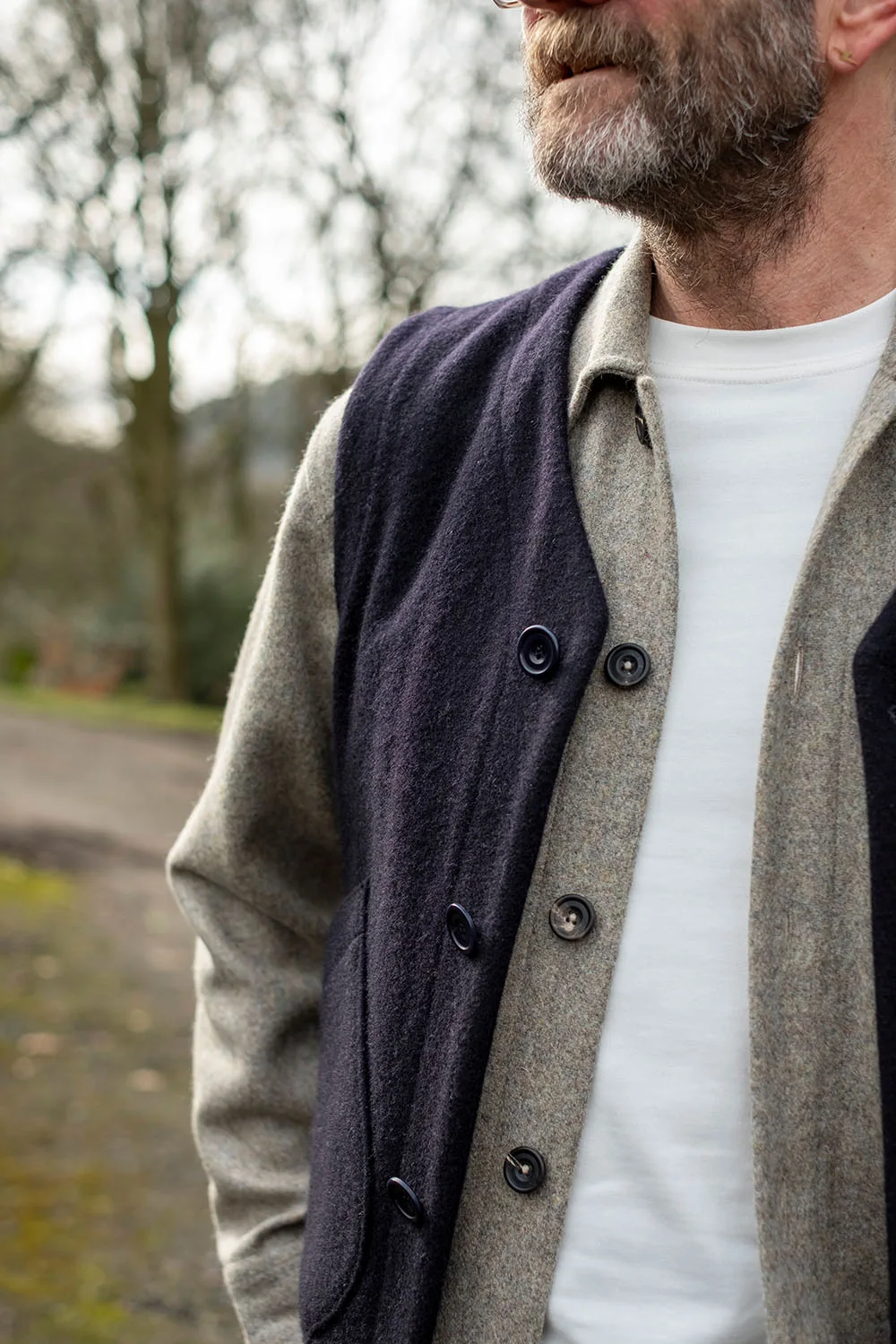 This is the second time we’ve made a vest in this style. Same easy, wearable shape. Different colour, and a different melton cloth that’s heavier and has a raised finish – brushed to tease out the fibre ends. The result is a vest that feels more sumptuous, softer to the touch, and warmer on the body.