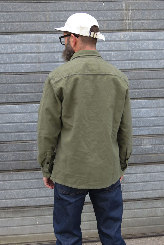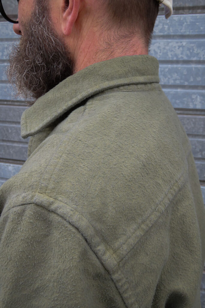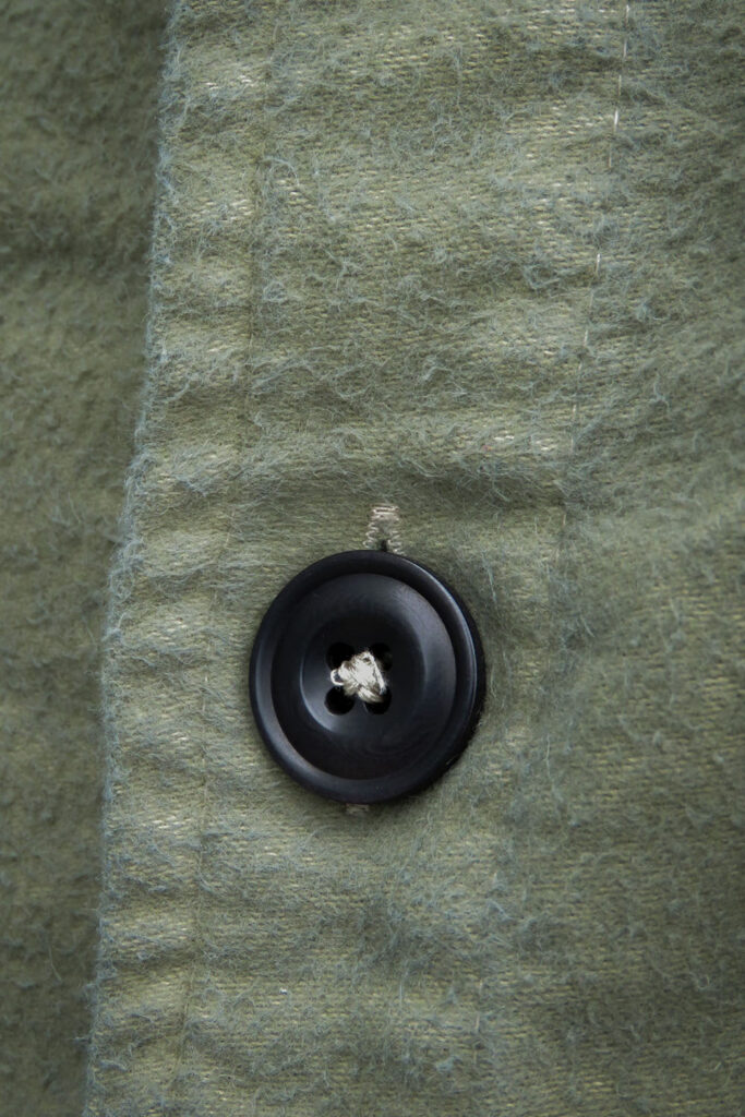 We’ve been wanting to try this technique before as the results change not just the colour but also the finish of the cloth. In this case we have a vintage looking, slightly distressed finish. It’s like a gem that you might find in a vintage shop pile of old military surplus. This is the kind of shirt that would have been the favourite bit of cosy kit owned by a lone sentry out in the night guarding a checkpoint somewhere on the Iron Curtain. Worn, washed and loved, already packed full of character.
