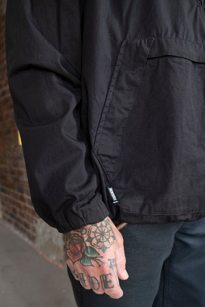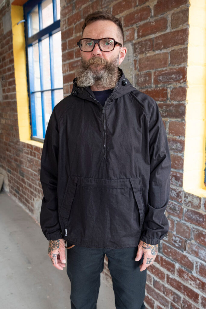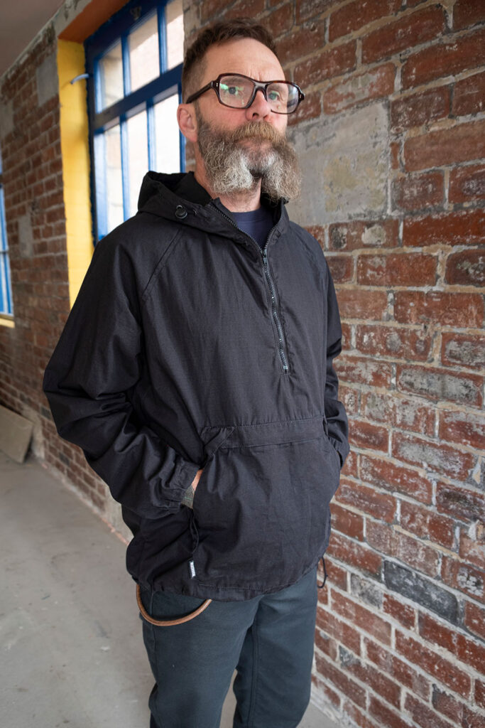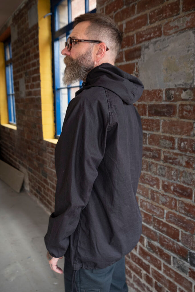 A pullover hooded smock with spacious zipped map pocket and kangaroo pockets in a 100% organic cotton ripstop shell.