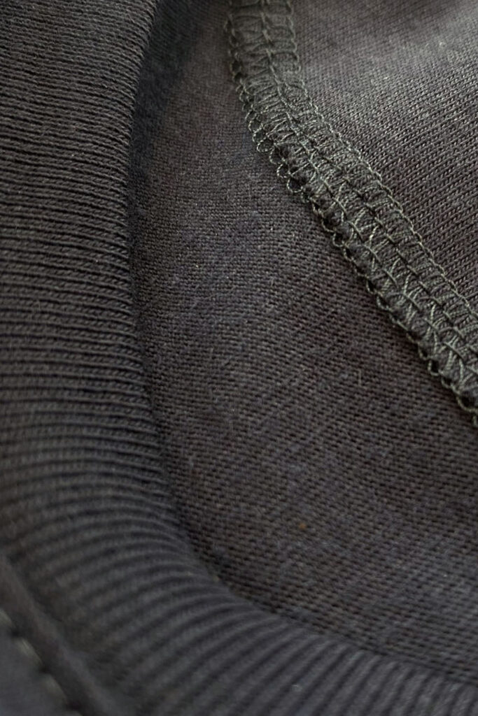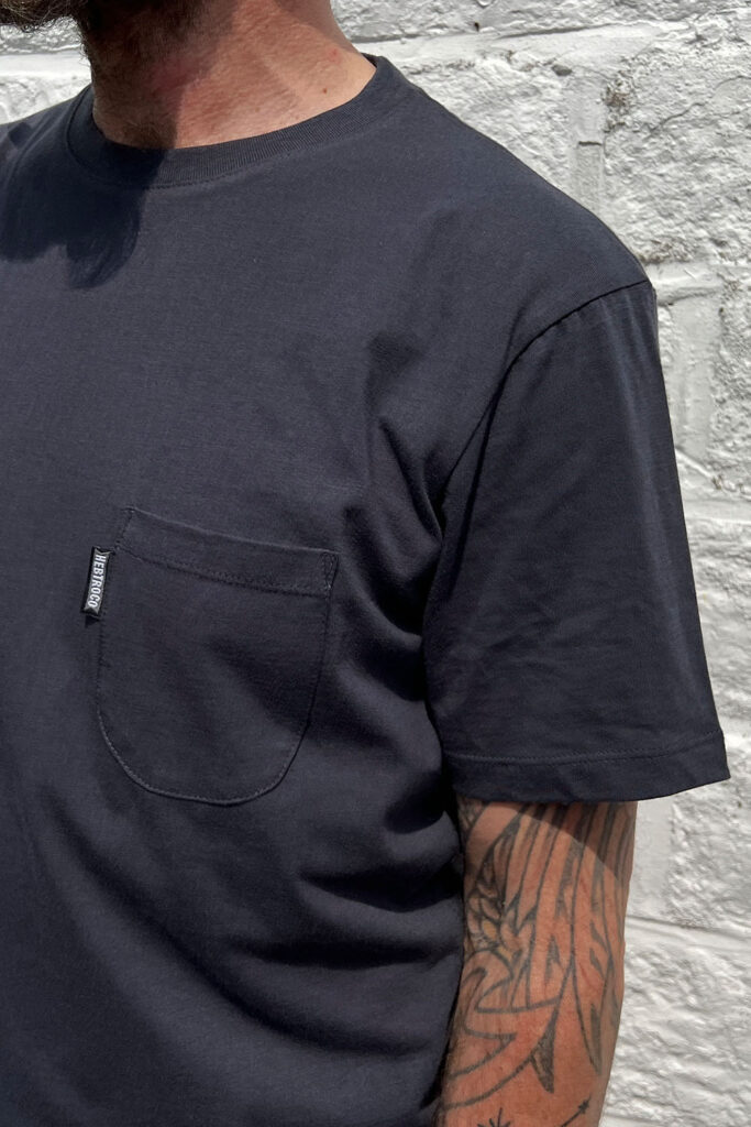 185gsm jersey, same as our other nicely mid-weight t-shirts but this time it’s 70% cotton and 30% seaweed/wood pulp.