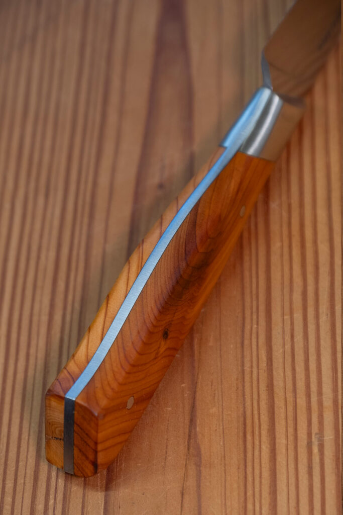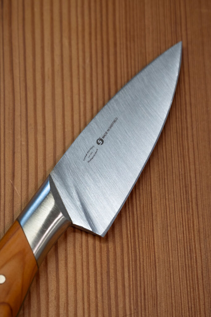 The satin finished blade is made from high carbon Silver Fox 100 – Sheffield’s Stainless Steel. Originally developed as a razor blade steel. SF100 is a fine-grained stainless steel, with the winning combination of toughness, corrosion resistance, ease of resharpening and polishing. Made in Stocksbridge, Sheffield. Sharp!
