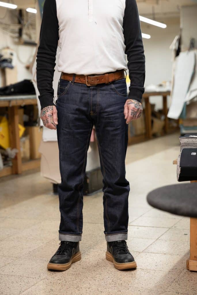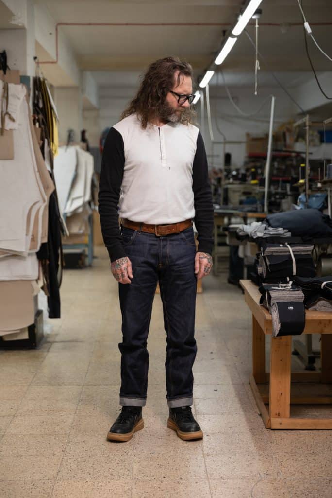 This is Ed wearing them. He’s a 32 waist, 28 leg, About 5’8″. He owns half the company.