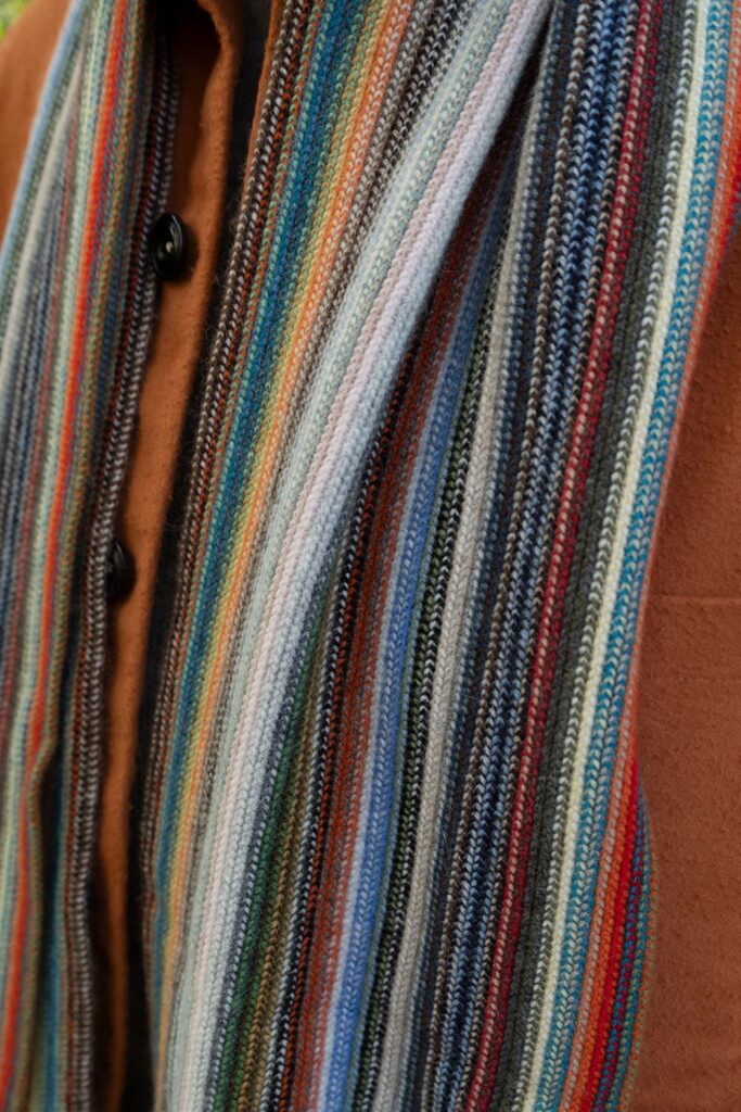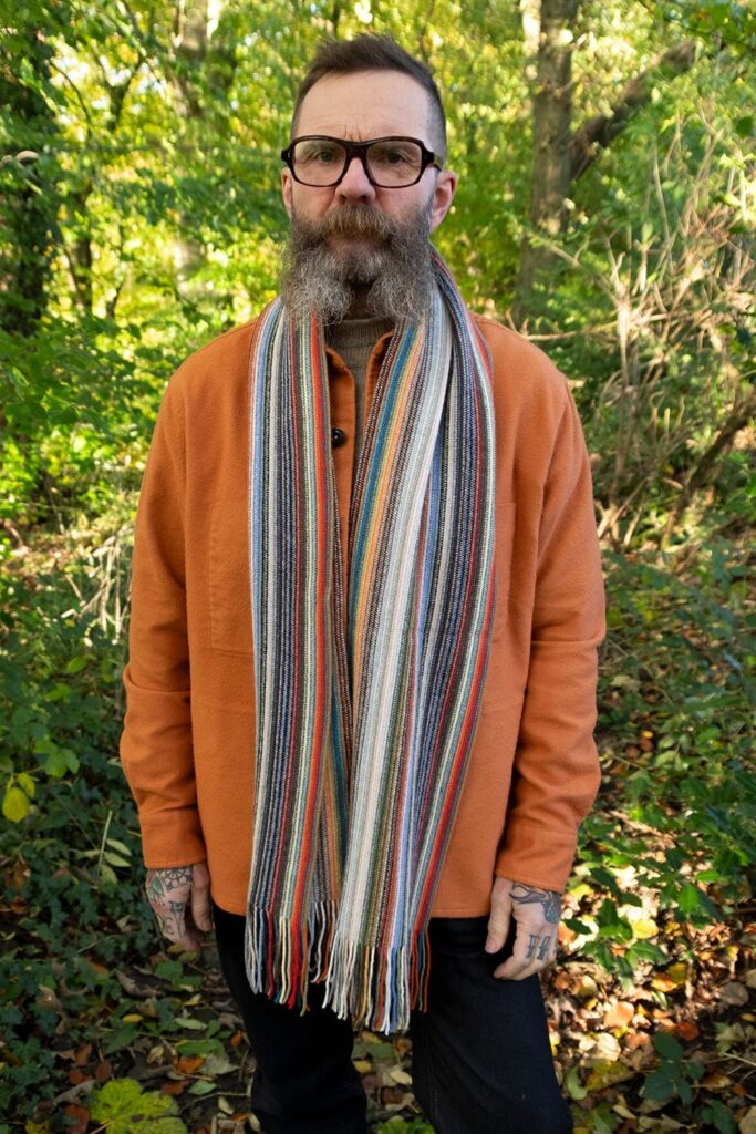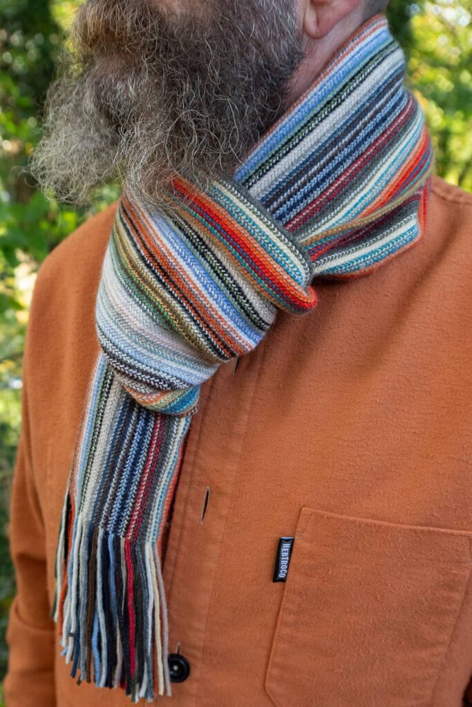 75% wool with 25% Angora. Super soft and fantastically colourful. 5’8″ long (the same as Ed!) and 8.25″ wide.