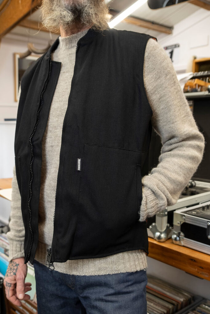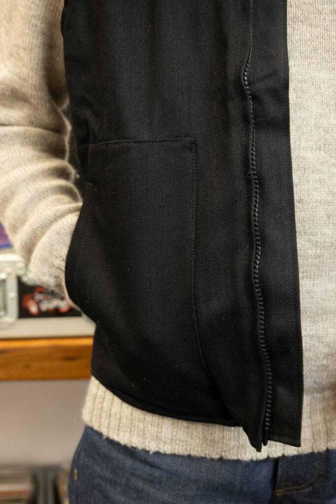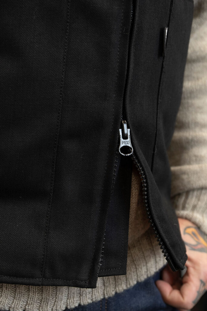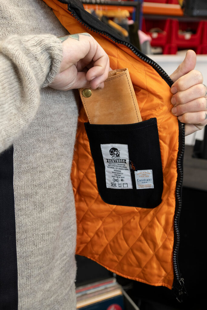 13.75oz selvedge denim, vibrant orange quilting, insulated with sustainable HD Wool fill from Saltaire, Bradford.