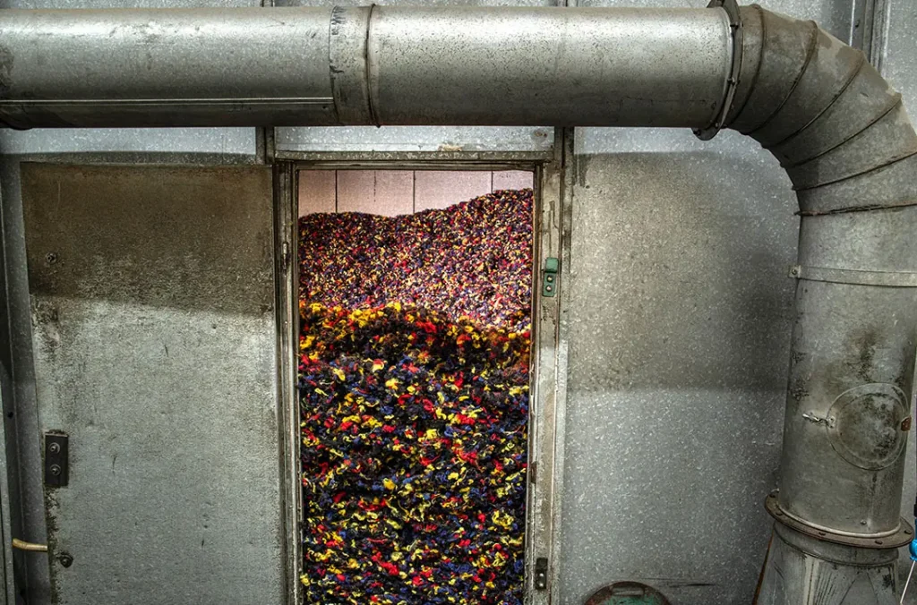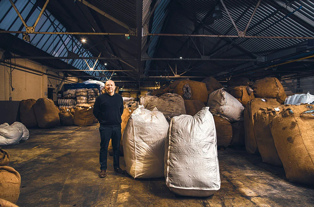 The mill blends its own died wool in tuft, 440kg at a time. The blended wool then goes for spinning into yarn at Gledhills, before returning to be woven.