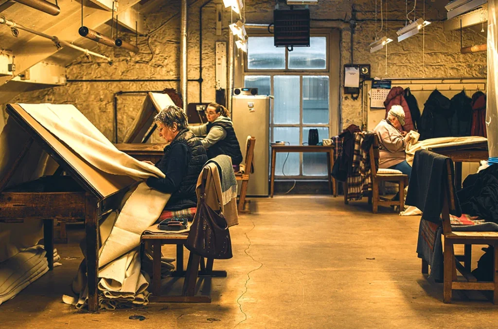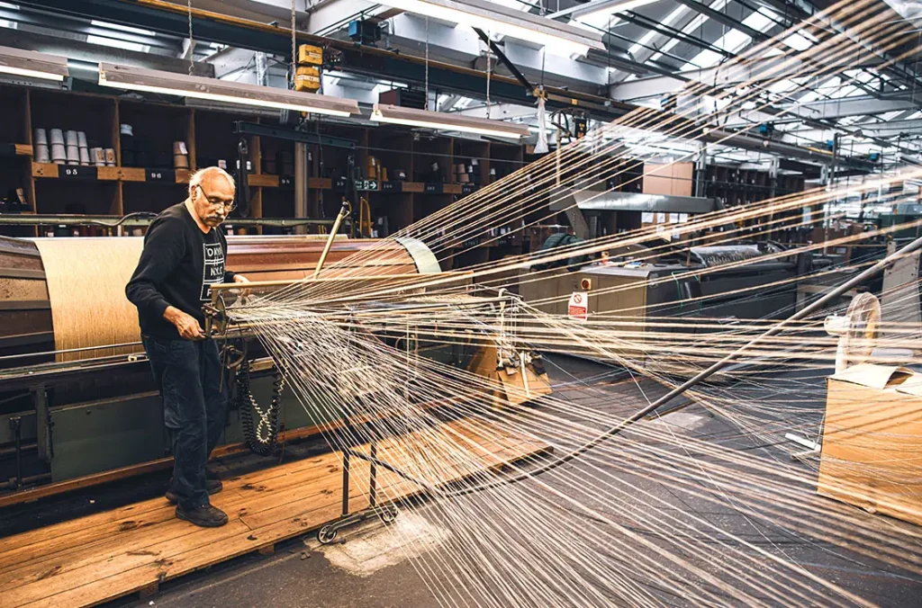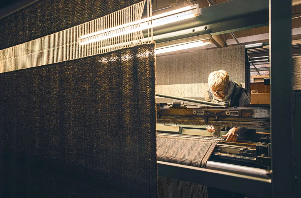 Every roll of fabric Mallalieus produce passes through the hands of the menders. Their fingertips feel for thread imperfections as they check every metre, then repair with needle and thread if needed. Clive the MD’s mother was a mender.